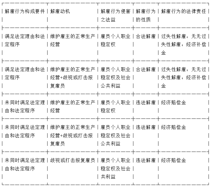 我国以《劳动合同法》为基础构建的解雇保护制度对协商性解雇(36条)、过失性解雇和无过失性解雇虽从积极要件(第39条、第40条、第41条)、消极要件(第42条)、程序要件(第43条)、法律结果(第48条、第87条)等方面进行了规定,但也引发了不少争议。有学者将我国解雇保护制度冠以“世界上最为严格”之名,批评其解雇保护过度而致用人机制僵化。有学者指出,我国解雇保护制度存在的不足在于未对歧视性、报复性等解雇行为等作出明确规定。有学者认为,应重构《劳动合同法》39条,例如,在某些方面扩大雇主的解雇权(譬如,加入兜底性解雇条款、营私舞弊引起的解雇不以“造成重大损害”为要件),在某些方面限制解雇权(譬如,因兼职而引起的解雇应以“影响本职工作”为前提、限制因被追究刑事责任而解雇的情形)。笔者也曾主张:“应在维持现行较为严格之解雇保护制度整体强度不变的基础上,适度降低无过失性解雇保护的力度,并有针对性地加重雇主违法解雇行为的法律责任。”既有之理论研究大多依循“平衡劳动者职业稳定权和用人单位经营管理权”的路径展开,鲜有学者提及我国解雇保护制度的个人本位路径依赖畸重,其所保护之法益以劳动者职业稳定权为主,对以“社会发展”“社会稳定”“社会公正”为表现形式的社会公共利益保护甚少。也就是说,《劳动合同法》以雇主违反实体性要件、程序性要件实施解雇行为侵害雇员职业稳定权为基础进行制度设计,未能充分虑及雇主凭借解雇行为对雇员进行歧视或打击报复以致侵害社会公共利益的可能性。这种以个人本位为基础建构的解雇保护制度瑕疵显见(参见表1)。