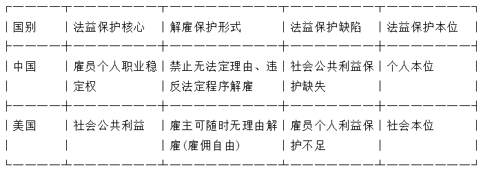 由表2可知,中美解雇保护制度的法益保护机制呈倒置关系:我国以个人本位为基础建构的《劳动合同法》侧重于保障雇员个人的职业稳定权,禁止雇主在无法定理由、违反法定程序的情形下实施解雇行为,但也暴露出“社会公共利益保护缺失”之弊端;以社会本位为基础,以公共政策理论为内核的美国解雇保护制度侧重于保障劳动关系中承载的社会公共利益,在排除对自由雇佣规则的适用时也暴露出“雇员个人利益保护不足”之瑕疵。