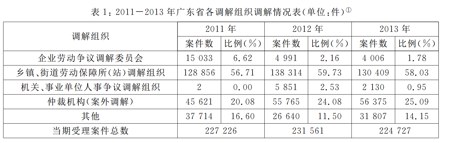 劳动仲裁机构及程序是根植于中国本土的制度选择。劳动争议先裁后审模式有其自身优势,可以起到拦截部分案件作用,且仲裁程序较之诉讼程序更为简化。事实证明,劳动仲裁通过以下途径分流法院劳动争议案件审理压力,取得了一定效果。(1)提高了基层调解成功率。以广东省为例,广东省乡镇、街道劳动保障所(站)在各类调解组织中排第一(参见表1)。劳动保障站主管部门为劳动行政部门,它通常与基层劳动监察和劳动仲裁派出庭一起办公,劳动仲裁派出庭对案件结果的评估影响以及劳动监察执法威胁对劳动保障所(站)调解成功与否有一定的促进功能,相对于其他调解组织调解有明显的调解优势。(2)劳动行政机构在处理劳资纠纷中有相当优势。劳动仲裁虽然有一定的行政依附性,但劳动行政部门在处理劳资纠纷中有着天然优势。目前,我国大型的群体性劳资纠纷解决一般是由劳动行政部门内部劳动监察、劳动仲裁、维稳部门等一起统筹联合处理,许多重大劳资纠纷在申请劳动仲裁之前就已经解决,从而分流了案件司法处理的压力。即使现有劳动仲裁机构人员编制有限、权力有限,某些地方劳动仲裁对劳动争议案件分流作用也非常明显。如深圳市劳动人事争议仲裁院提供的数据显示,2015年全市劳动仲裁案件起诉率为19.80%,即近80%的案件就在劳动仲裁阶段息讼。劳动仲裁阶段化解了大量劳动争议案件,极大减轻了人民法院的审判压力。(3)劳动仲裁员处理劳动争议专业化程度逐年提高。经过几十年发展,我国已经建立了一支专门处理劳动案件的劳动仲裁队伍。《劳动争议调解仲裁法》第20条对劳动仲裁员资格条件限制的规定,提高了劳动仲裁员的准入门槛。为了实现裁审衔接,各地不断组织法官给仲裁队伍培训,劳动仲裁员的素质和水平有明显提升,一裁终局的撤裁率一直处于较低水平。(4)劳动仲裁方式灵活、程序简化。劳动仲裁审限最长为60日(一般审限45日,特殊延长不超过15日)。相对于一审二审的诉讼周期,劳动仲裁审限已经被压缩最短。为了提高劳动仲裁效率,各地纷纷探索劳动仲裁程序简化机制,如深圳市劳动人事争议仲裁院率先推出对简单案件实行要素式裁判文书裁决,提高裁判文书撰写效率。广东省劳动争议仲裁尝试采用就地就近仲裁原则,通过公告送达、上门调解、网上送达、现场开庭等便捷灵活方式,简化程序,快速解决停产、倒闭企业的集体争议,以确保社会稳定。这些优势是法院所不具备的。