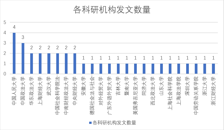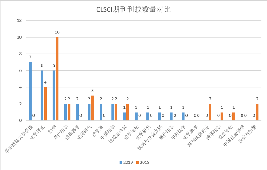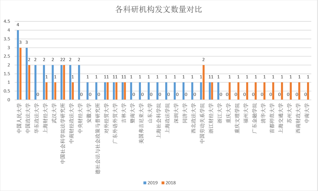 我们对社会法论文发表情况的分析主要围绕论文发表数量展开。“论文发表数量”通过统计各科研机构文章发表数量和CLSCI各期刊刊载文章数量予以展现,并将2019年的论文发表情况与2018年进行对比。其中,2019年度CLSCI期刊《中国社会科学》《环球法律评论》《政治与法律》《清华法学》《政法论坛》并无收录社会法相关主题论文,故在以下部分图表中隐去。具体收录情况如下: