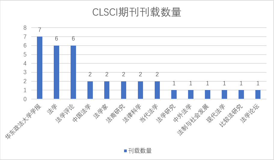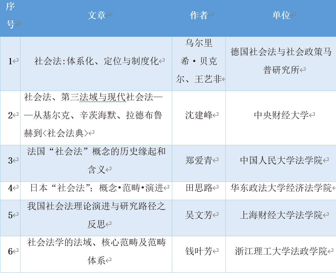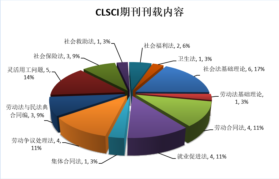 2018年CLSCI期刊共收录2篇有关社会法基础理论的文章,分别为钱叶芳教授所撰写《论公共管制权——构成社会法核心范畴的新型国家权力》与蔡晓荣教授所撰写的《民国时期的社会法理论溯源》。2019年CLSCI期刊共收录6篇有关社会法基础理论的文章,分别为乌尔里希·贝克尔教授撰写、王艺非博士翻译的《社会法:体系化、定位与制度化》;沈建峰教授撰写的《社会法、第三法域与现代社会法——从基尔克、辛茨海默、拉德布鲁赫到<社会法典>》;郑爱青副教授撰写的《法国“社会法”概念的历史缘起和含义》;田思路教授撰写的《日本“社会法”:概念•范畴•演进》;吴文芳副教授撰写的《我国社会法理论演进与研究路径之反思》;钱叶芳教授撰写的《社会法学的法域、核心范畴及范畴体系》。