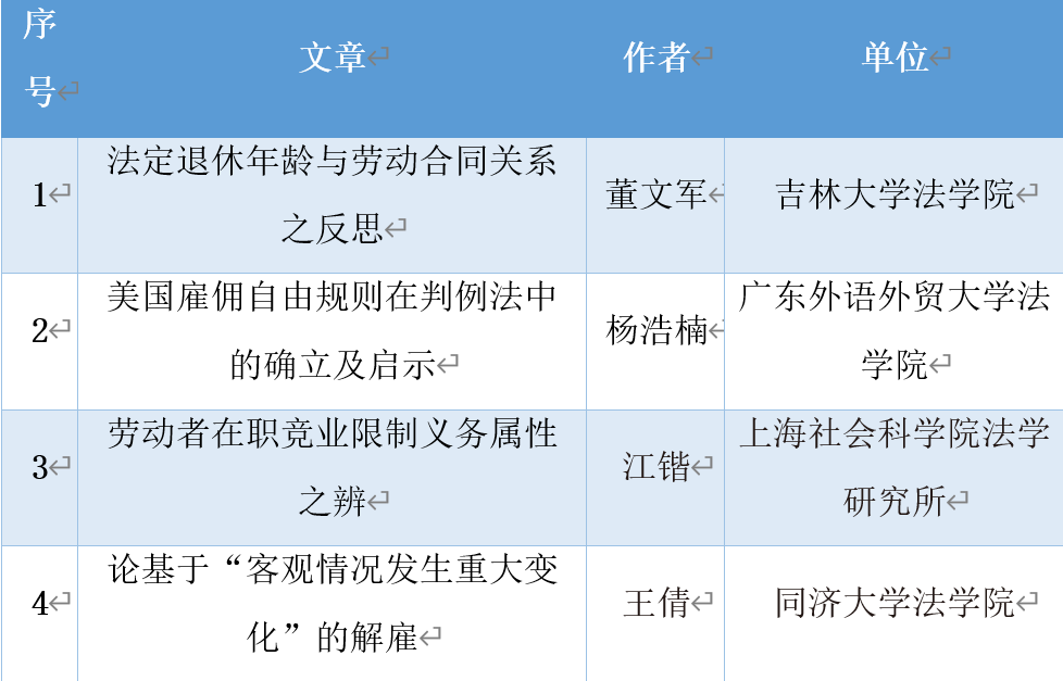 2019年收录4篇劳动合同主题的论文,分别为董文军副教授撰写的《法定退休年龄与劳动合同关系之反思》,江锴老师撰写的《劳动者在职竞业限制义务属性之辨》,杨浩楠副教授撰写的《美国雇佣自由规则在判例法中的确立及启示》和王倩副教授撰写的《论基于“客观情况发生重大变化”的解雇》。