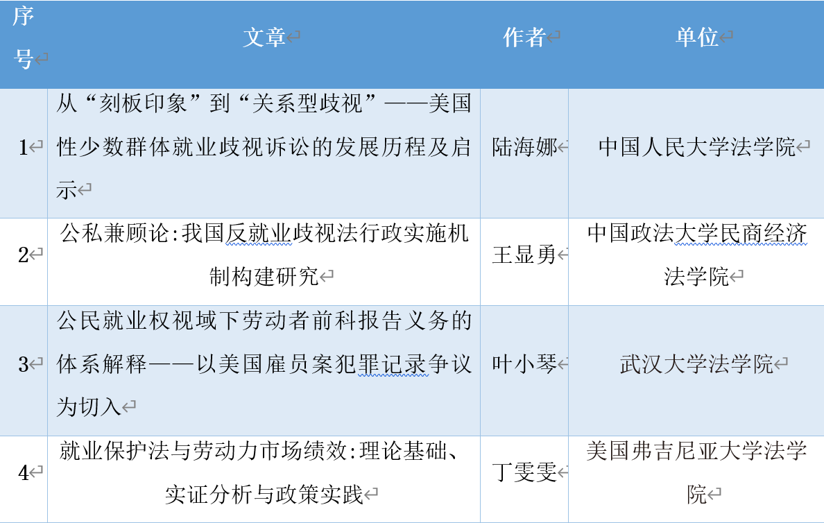 为扩大就业并切实保障劳动者的平等就业权,就业促进法发挥至关重要的作用,特别是在反对就业歧视领域,同样引起学界广泛关注。2019年CLSCI期刊共收录4篇就业促进法相关文章,主要涉及反就业歧视和就业促进法与劳动力市场动态协调等内容,具体内容如下: