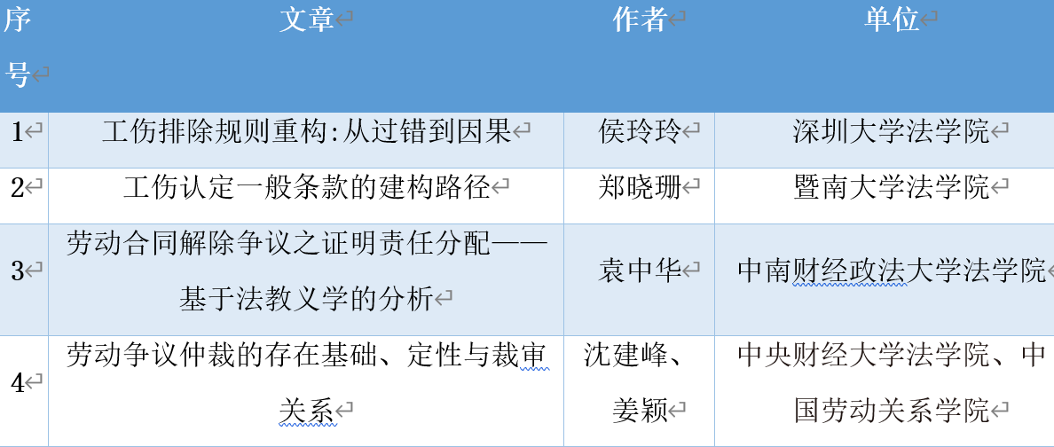 为厘清劳动者与用人单位之间发生劳动争议时的权利义务关系,诸位学者在工伤认定及排除规则、劳动合同解除争议的证明责任分配以及劳动争议仲裁等领域积极展开研究,并取得丰硕成果,为劳动争议解决实践提供理论基础。2019年CLSCI期刊共收录4篇劳动争议处理法相关文章,具体内容如下: