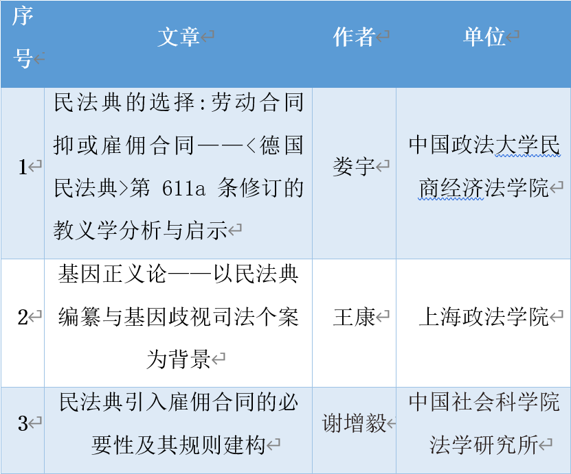 随着民法典的出台正式进入“倒计时”,劳动法与民法典之间的关联成为社会法学研究的热点话题,其中尤以劳动合同与雇佣合同之争议为甚。2019年CLSCI期刊共收录3篇劳动法与民法典相关文章,具体内容如下:
