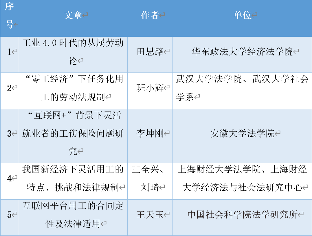 互联网平台用工的兴起以及各种灵活用工形态的发展,对传统的劳动法规制提起严重挑战,这也成为社会法学界的研究热点。延续2018年对于新用工形式和新型劳动者的劳动法规制研究热潮,2019年CLSCI期刊共收录5篇灵活用工的劳动法规制相关文章,具体内容如下: