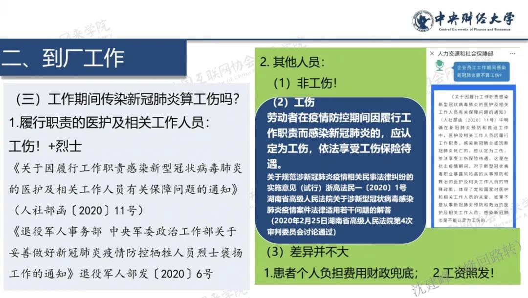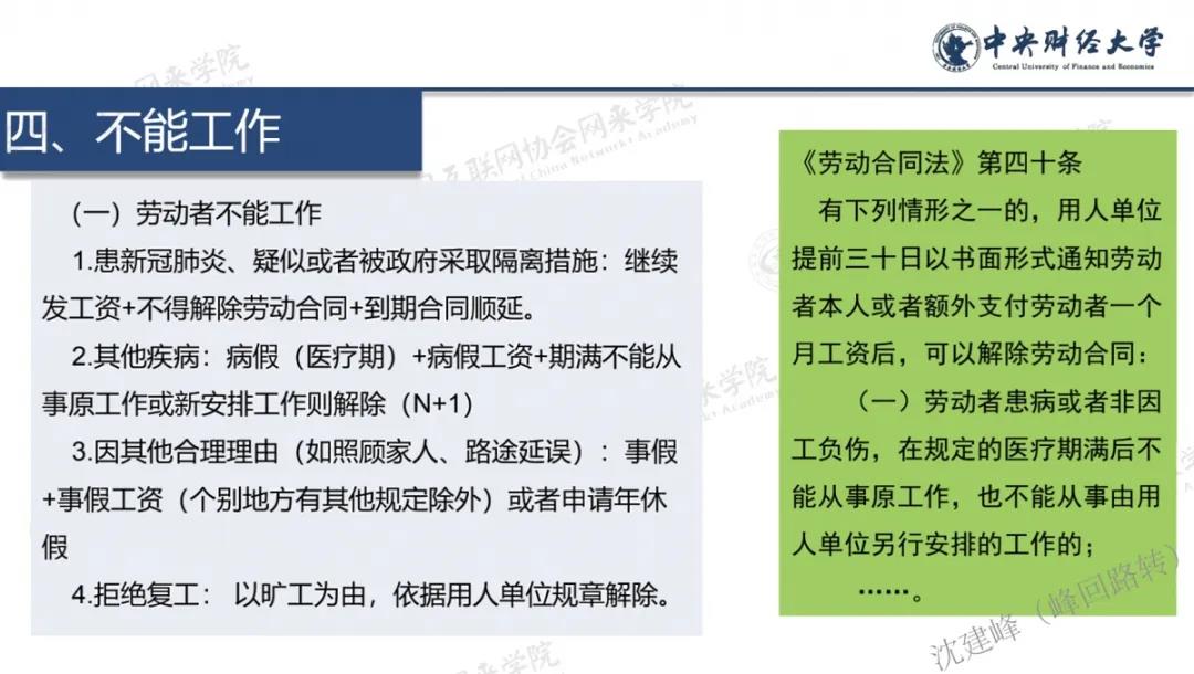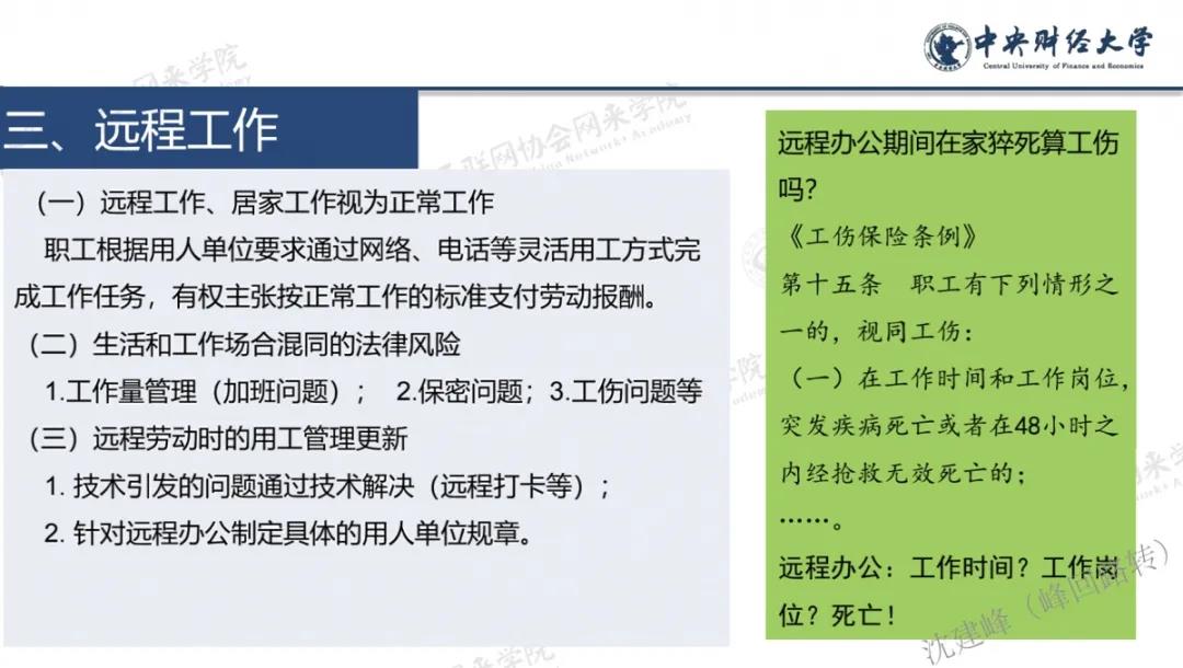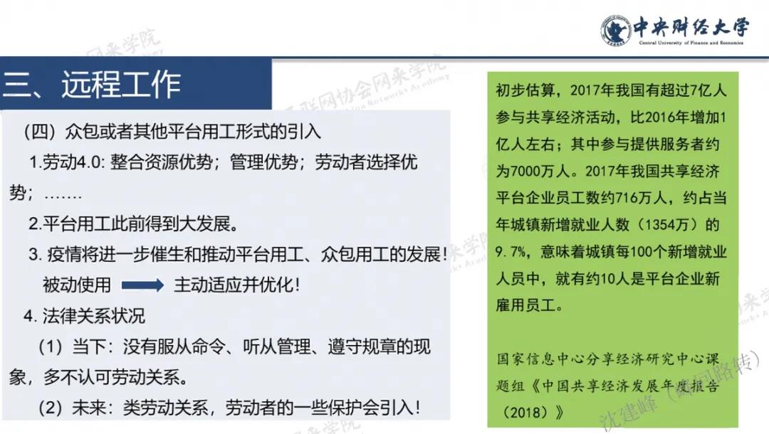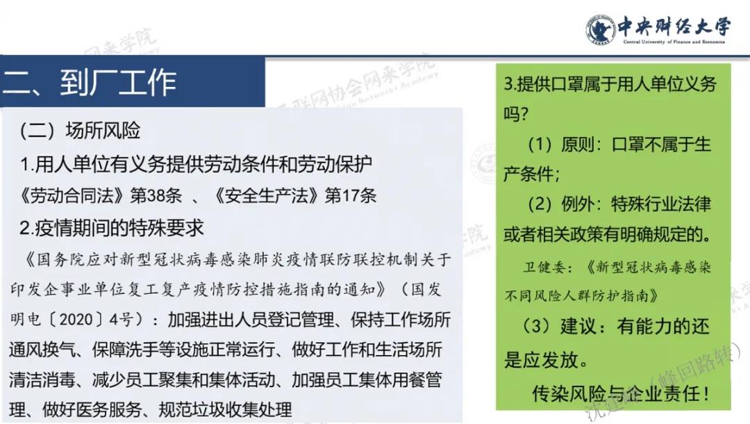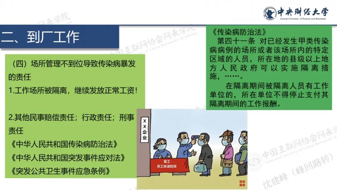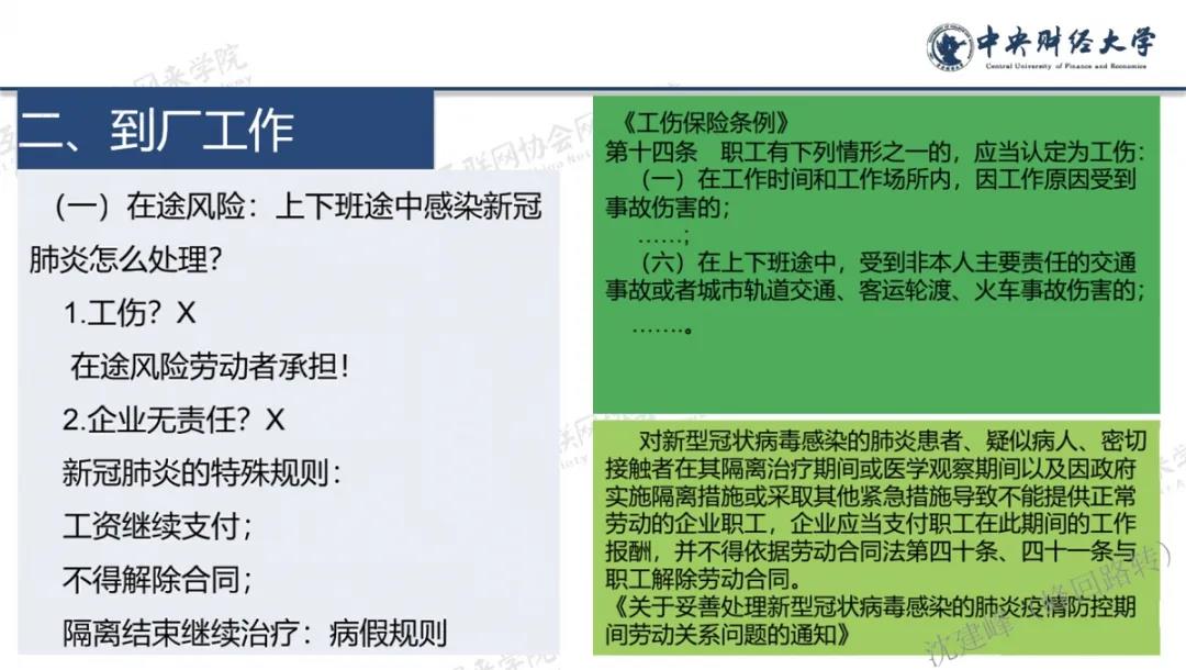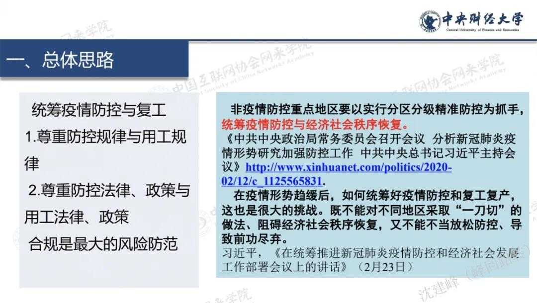 大家好,我是中央财经大学法学院的沈建峰。很高兴有机会和大家就复工后的用工规范和风险防范做一个小小的交流,也非常感谢主办方的邀请。