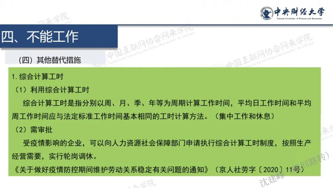 在疫情的背景之下,因为影响时间太长,影响面比较广,为了劳动者和用人单位能够同舟共济、共渡难关,我们看到在人力资源管理的实践中,也是在法律的实践中慢慢出现了一些其他的解决不能工作时的替代措施。在这些替代措施里面有两种非常值得关注的,第一种是综合计算工时制度的运用。要想理解综合计算工时,先理解我们国家工时制度的基本情况,我们正常的工时是每天工作不超过8小时,每周工作不超过40小时,如果超过了就应该支付加班费,这是正常的工作时间制度。但在企业的生产过程中,我们会看到一些特别的企业形态或者经营需要,比如说船员需要出海,出海一两个月才能回来,所以在出海期间,给他放周休日也没有地方休息。