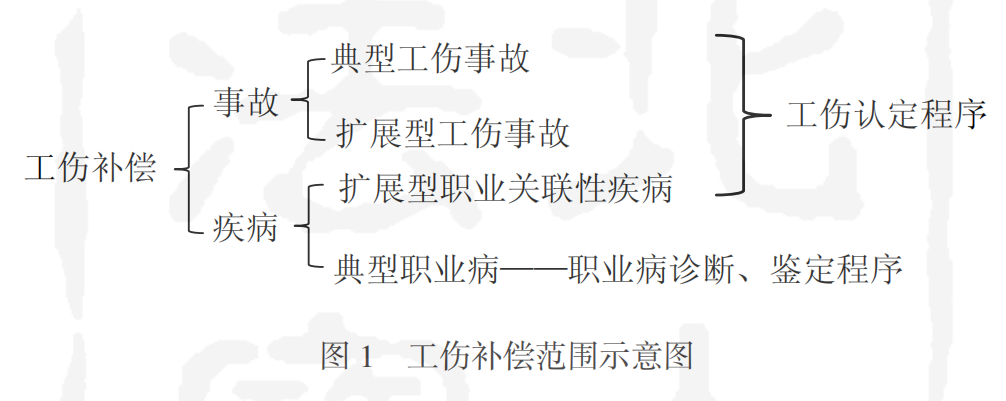 但是,相对于职业因果关联近乎完美的“目录”内病种而言,这一拟制难免略显薄弱,因此至多只能作为工伤保护外围领域的扩展型职业关联性疾病。这种扩展与传统事故工伤在时间、空间、原因等维度上的适当延展、发散及社会化演变乃属同一过程。后者延伸出准备、收尾阶段的附随性保护,与上下班途中的通勤保护等扩展型工伤事故类似,而前者则延伸出“过劳死”(包括48小时工伤)、“过劳自杀”等职业关联性疾病。这时工伤保护之结构恰如图1所示。