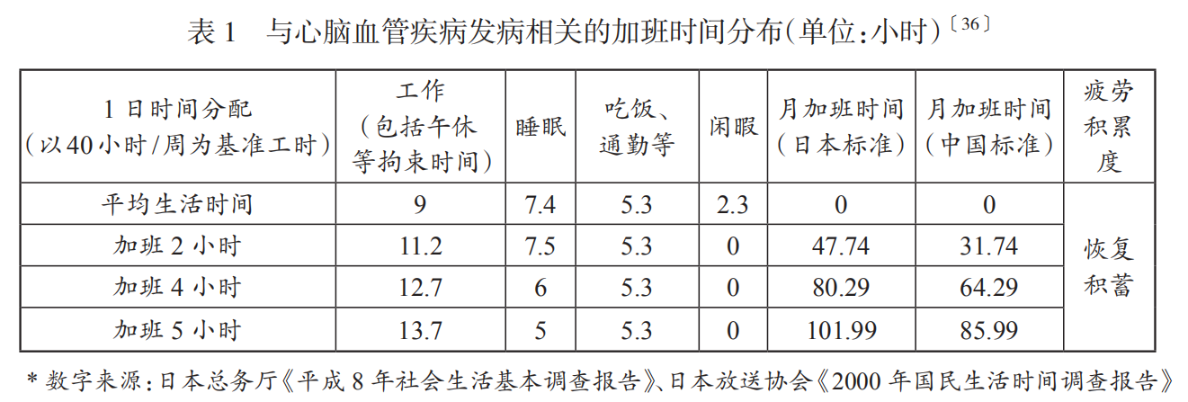 长期过劳的起算点则通常以各国(地)法定加班上限为基础,如日本采45小时/月标准,而我国则宜采36小时/月。虽然因法定基础工时不同,在总工作时间上我国标准要比日本标准高出很多(约等于日本法上的每月加班52小时),但36小时之内,毕竟仍属合法加班之维度,该维度属劳资博弈确定的立法标准,行政标准只能尊重而不宜擅动。此时,若将前述中长期过劳标准与我国立法相衔接,则可呈表2第3~4项所示。