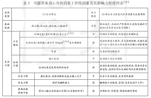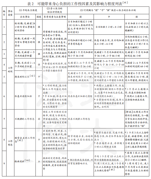 要矫正该偏颇,就得先为这些“质”上因素预设出清晰、明确且易于取证、适用的等级化指标。当然,这一工作仍必须有充分的产业医学支撑与适宜的配套技术标准。比如,在夜班的频度及换班方式上,医学领域早已根据劳动者的健康需求,提出了明确的禁止性命令。对于这些成熟的标准,我们诚应妥善吸收(如表2第9项),而对于那些由精神负荷而产生的过劳,则可以日本厚生劳动省“因心理负荷引发精神障碍之业务上外判断指南”为基础,根据心脑血管疾病的特点做出改进。