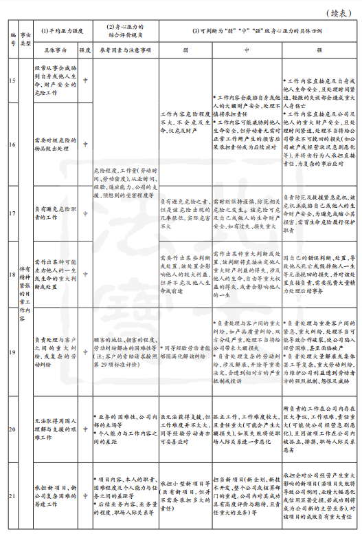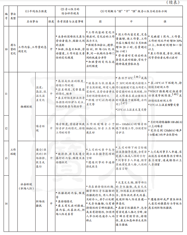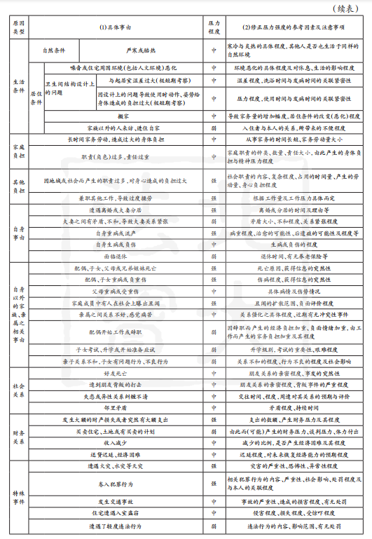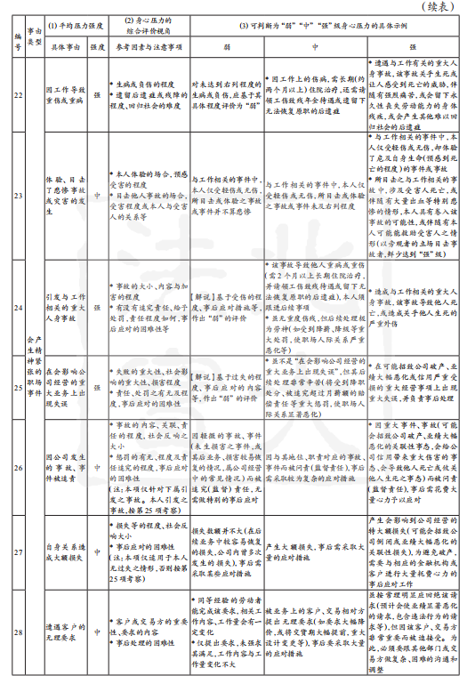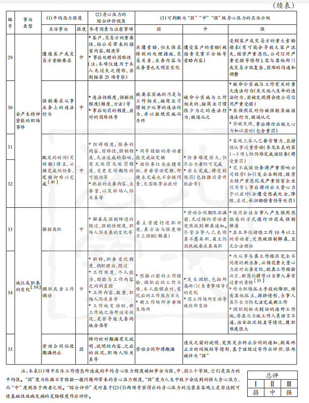 如上,若个案情形与表2中列明的具体示例间表现一致时,则可直接根据表2评价其压力强度;若不完全一致时,则需根据“具体压力事由”后标示出的“综合评价视角”,参考具体示例对个案作出评价。此际需对事件本身与事件后状况分别作出单项评价,在下列情形中,可综合评价为“强”:A事件本身的身心压力很强,之后本人还需针对该事件作出必要的后续应对;B事件本身的身心压力程度为中等,但由其产生的后续应对工作非常困难。