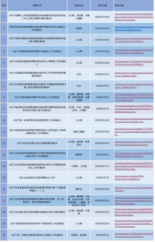 2020年初,我国爆发新冠肺炎病毒疫情。为深入贯彻落实党中央和国务院关于打赢新冠肺炎疫情防控阻击战的决策部署,切实做好疫情防控期间各项工作,人社部、民政部、全总、最高法、财政部、卫健委等多家机关出台相应的政策、文件以应对新冠肺炎给国家和社会带来的冲击,其范围包括劳动关系、工资支付、社保缴费、就业促进、社会救助、休息休假等多个方面。