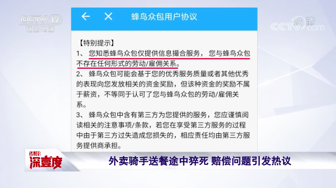 2019年10月,韩某伟通过蜂鸟众包APP注册成为外卖骑手。在注册成为平台骑手之前,用户须阅读同意《蜂鸟众包隐私权政策》和《蜂鸟众包用户协议》。值得注意的是,在《蜂鸟众包用户协议》里,有一项“特别提示”明确表示:蜂鸟众包仅提供信息撮合服务,用户与蜂鸟众包不存在任何形式的劳动/雇佣关系。