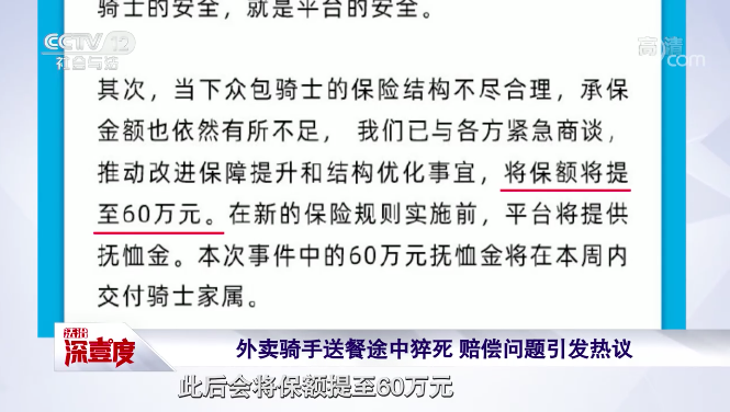 该事件引发了网友热议。最终,2021年1月8日,饿了么官方对此事作出回应,称当下众包骑士的保险结构不尽合理,承保金额有所不足,此后会将保额提至60万元。此次事件中的60万元抚恤金,也将在一周之内交付韩某伟家人。