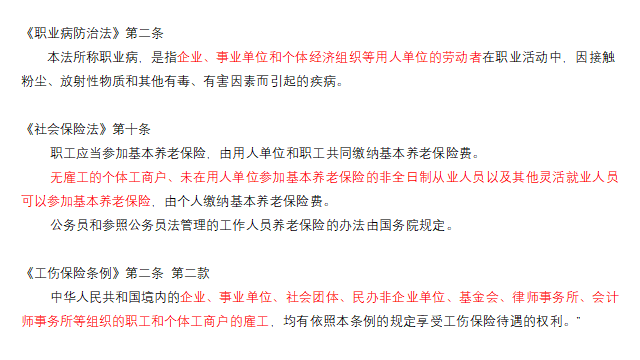 在各类社会保障法中会根据自身特点对劳动法中“劳动者”概念进行适当的缩小或扩大的解释,比如《职业病防治法》第2条的规定基本与劳动法保持一致,即与用人单位建立劳动关系的劳动者是本法所保护的对象。而《社会保险法》中所保障的对象根据不同险种其主体范围也有所不同,比如养老保险就包括了退休人员、也可能涵盖城镇个体工商户等,范围更广;根据《工伤保险条例》第2条则将规制主体划分为职工和雇工两类。
