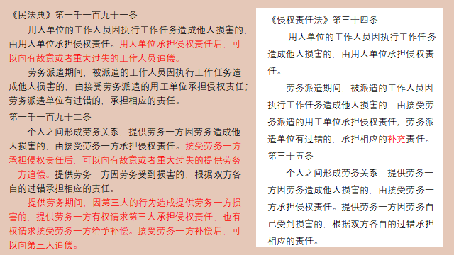 2004年实行现已失效的《关于审理人身损害赔偿案件适用法律若干问题的解释》第11条“雇员在从事雇佣活动中遭受人身损害,雇主应当承担赔偿责任……属于《工伤保险条例》调整的劳动关系和工伤保险范围的,不适用本条规定”,体现了雇员和劳动者的区别:在雇佣关系中,雇员因工伤事故遭受人身损害,雇主应承担民事侵权赔偿责任,而在劳动关系中劳动者发生工伤事故遭受人身损害的,用人单位则适用工伤保险进行赔付。但在2020年底修改的该司法解释中,删除了第11条,通篇未在出现“雇员”一词,仅保留了原来的“劳动者”和“无偿提供劳动的帮工人”等主体概念。在民法典中也未出现“雇员”和“雇佣”等词,但其第1191条和第1192条规定,相较于原来《侵权责任法》第34条和第35条更加明确了当事人之间的责任,强化了劳务派遣单位和接受劳务一方的义务履行。