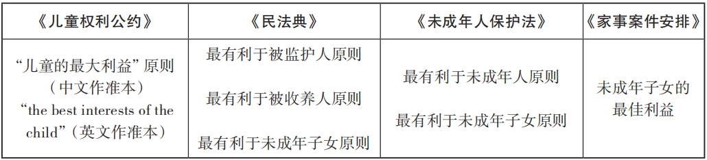 鉴于《儿童权利公约》之“儿童”与我国法律文件中使用的“未成年人”均指不满18周岁的自然人,二者在内涵及外延上并无二致,前述论著中“未成年人利益最大化原则”和“儿童利益最大化原则”都是对《儿童权利公约》中儿童最大利益原则的援引。需要澄清的是,在国际人权法体系中,《儿童权利公约》中文作准本如同国内法律文本一样权威,而该文本中并无“儿童利益最大化”的表述,如准确援引应是“儿童最大利益”原则,对应至英文作准本则是“the best interests of the child”。实际上,某些更为晚近的规范性文件在表述上已经愈加接近国际公约的表述,如2022年2月生效的《关于内地与香港特别行政区法院相互认可和执行婚姻家庭民事案件判决的安排》(表1中简称《家事案件安排》)第9条规定在审查决定是否认可和执行相关判决时,应当充分考虑“未成年子女的最佳利益”。“最佳利益”与“最大利益”同出一源(“the best interests”),是对儿童最大利益原则另一风行但并不严谨的化称。简言之,我国立法中的“最有利于……”表达范式与《儿童权利公约》中规定的“儿童最大利益”原则存在法律制定和法律适用上的逻辑关联和对应关系,如表1所示。