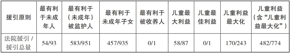 再次,“最有利于……”系列原则内部,各具体原则的援引存在较大的差异性。其中,最有利于被监护人原则确立最早,自2017年《民法总则》明确该原则以来,适用案件数逐年攀升,且绝对数量可观;最有利于未成年子女原则的援引远远不及最有利于被监护人原则,部分原因或在于司法解释文件历来对离婚后子女抚养问题有相当详细的指引,质言之,规则众多使得原则的适用空间受到限制,反映出裁判系统更加倾向于稳定、明确和低风险;最有利于被收养人原则的援引仅为1篇,且该原则并非此案决定性裁判依据,一个合理的解释是,该原则主要运用于收养行政而非司法裁判。