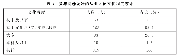 (2)网约车司机与餐饮外卖骑手在文化层次上以高职文化为主。从参与本次线上问卷调研的人员的文化层次看,高中以及相对于高中的中专、技校和职校文化程度的人员共168人,占总数的52.7%,其他依次为大专、初中及以下和本科及以上,分别占26.0%、16.6%和4.7%(见表3)。值得关注的是,网约车司机与餐饮外卖骑手对从业人员文化水平和专业技能的要求并不高,但仍然能吸引本科及以上高学历人员的加入。在我们与美团、滴滴、饿了么、T3出行、顺丰等新业态平台企业管理人员座谈时,美团管理人员也指出存在高学历人员加入劳动密集型新业态就业增长趋势的现象。