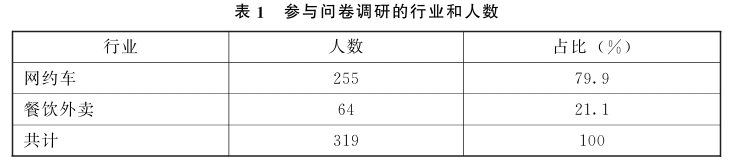 在江苏省相关部门的协助下,我们对平台企业从业人员进行线上问卷调查,最终获得319份有效问卷,参与问卷调研的人员集中在网约车司机和餐饮外卖骑手两个职业,其中网约车平台司机255人(滴滴平台司机251名,T3平台司机4名)占参与问卷调研总人数的79.9%;美团外卖骑手64名,占参与问卷调研总人数的21.1%(见表1)。