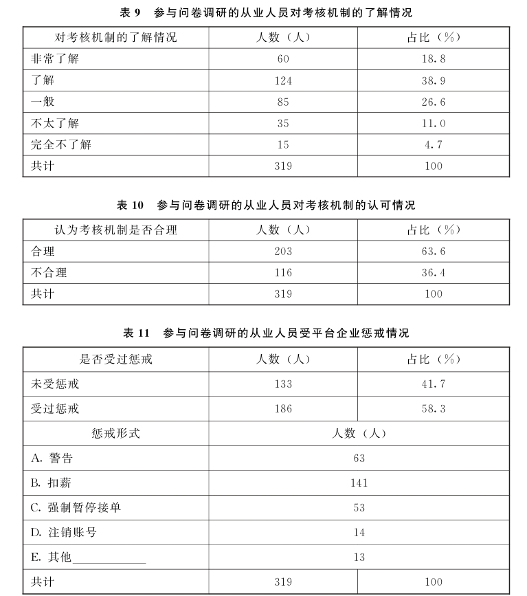 参与问卷调研的从业人员都认可平台企业或者管理第三方对其有考核机制,半数以上的人了解考核机制的内容并认为考核机制合理,但仍然有三成多的从业人员认为平台企业考核机制不合理(分别见表9和表10);不合理的原因主要集中于“平台抽成高”、“工作时间长”、“没有加班费”和“霸王条款”这几个方面。另外半数以上平台从业人员受到过平台企业的处罚,其中141人受到了扣薪的处罚(见表11)。