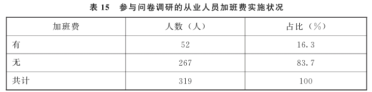4.延长工作时间但没有加班费或者加班补贴的占八成以上(见表15)