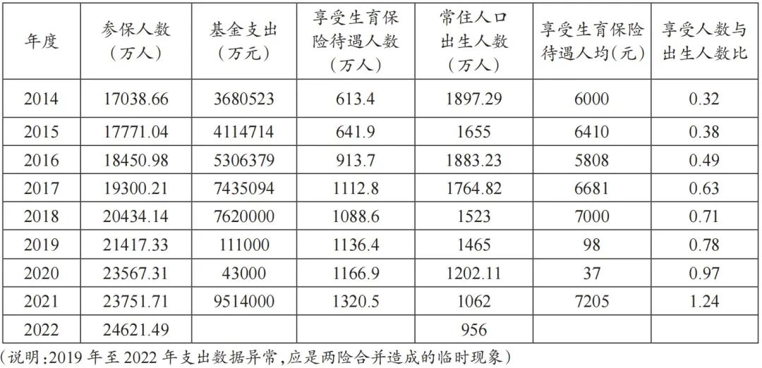 综合来看,生育津贴是我国《社会保险法》规定的一项生育保险待遇,而女职工产假权益保护所确定的未参保规则是在用人单位与劳动者之间的权益配置,与社会保险基金支付的关系不大,故本文讨论的生育津贴给付之法律仅限于《社会保险法》,准确来说,是以《社会保险法》第56条为评价基础展开的。第56条罗列了职工享受生育津贴的情形,包括两个具体情形和一个授权兜底情形,除此之外,并无特别限制。其中,情形一“女职工生育享受产假”最为常道,我们一般所理解的生育津贴也主要是就此情形而言的。这意味着,出现所列之情形,职工就享有生育津贴请求权。即事实出现即可享,如有限定也应在事实本身。由此推测,生育津贴给付应该是普惠的。从表1整理的国家统计局的年度数据可见,2014年至2022年,生育保险参保人数逐年增长,生育保险基金支出逐年增加,享受生育保险待遇人数逐年增加,而常住人口出生人数却在波动减少。享受生育保险待遇人数与常住人口出生人数相比逐年明显提升,乃至人数比超过1,说明能够享受生育医疗待遇的人数已接近全部。但是,统计数据不区分生育保险待遇中的医疗费用和生育津贴,而从享受生育保险待遇人均金额来看,从6000元浮动到7000元多,不仅变化不明显,而且远不及按照平均工资计算的产假工资。以2022年城镇单位就业人员平均年工资114029元,产假98天来估算,生育津贴待遇均值约为30616元。前后比较可知,生育津贴给付中必然存在着限制。从某城市公布的数据看,享受生育津贴待遇人数大约是报销生育医疗费用人数的三分之一。生育医疗费用已然普惠,而生育津贴给付面却不大,女性分娩后享受生育津贴待遇者可能仅在三分之一左右。