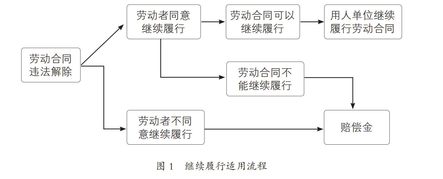 《劳动合同法》第48条设置了继续履行的适用逻辑:首先,劳动者是否要求继续履行劳动合同,若要求则继续履行,若不要求则适用赔偿金救济;其次,若劳动者要求继续履行,却存在“劳动合同已经不能继续履行”的情形,适用赔偿金救济。有法官认为,在用人单位违法解除劳动合同的前提下,双方继续履行劳动合同需同时满足两个条件:一是劳动者选择继续履行劳动合同,二是劳动合同能够继续履行。继续履行的适用流程见图1。