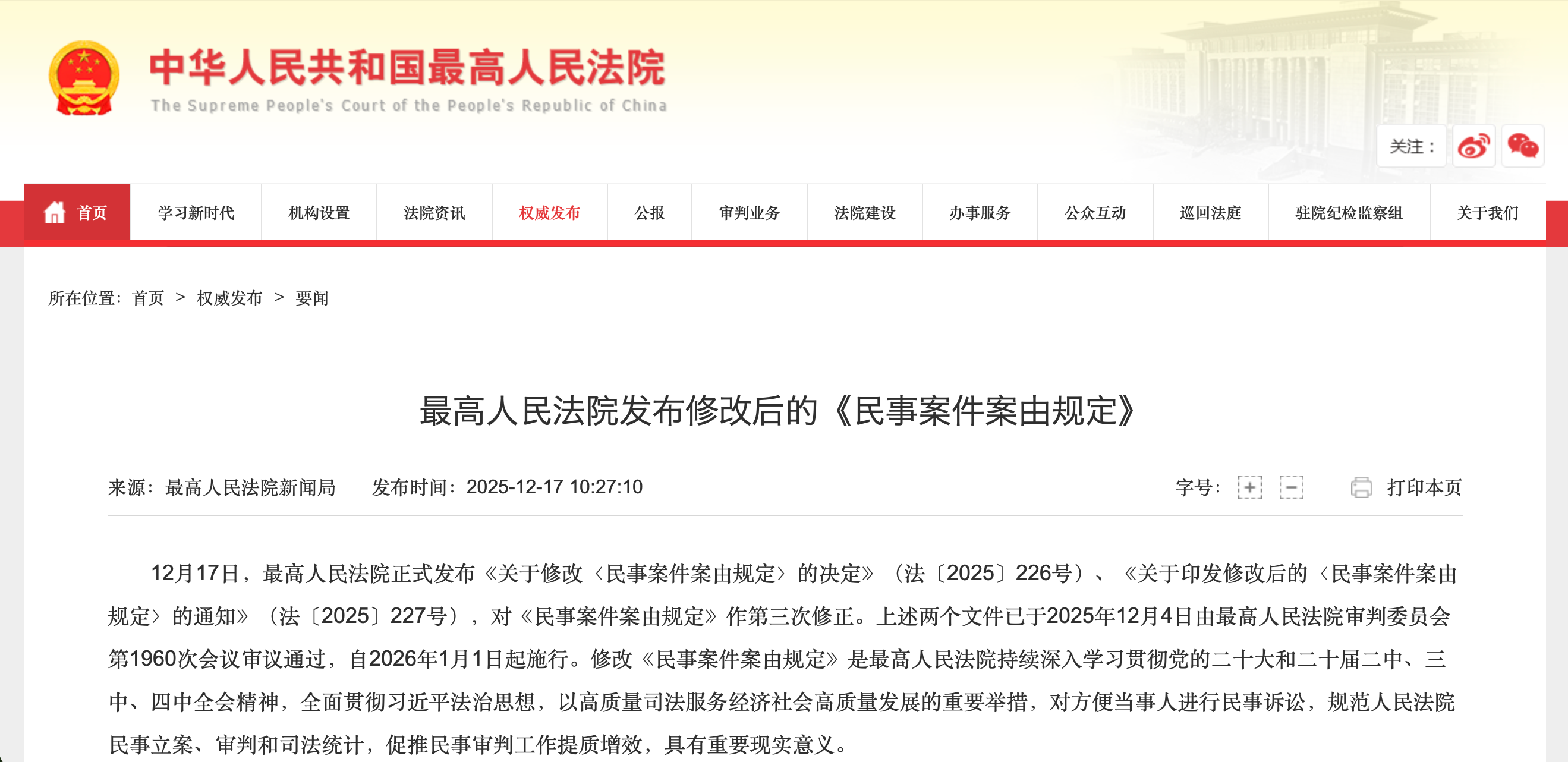 12月17日,最高人民法院正式发布《关于修改〈民事案件案由规定〉的决定》(法〔2025〕226号)、《关于印发修改后的〈民事案件案由规定〉的通知》(法〔2025〕227号),对《民事案件案由规定》作第三次修正。上述两个文件已于2025年12月4日由最高人民法院审判委员会第1960次会议审议通过,自2026年1月1日起施行。修改《民事案件案由规定》是最高人民法院持续深入学习贯彻党的二十大和二十届二中、三中、四中全会精神,全面贯彻习近平法治思想,以高质量司法服务经济社会高质量发展的重要举措,对方便当事人进行民事诉讼,规范人民法院民事立案、审判和司法统计,促推民事审判工作提质增效,具有重要现实意义。