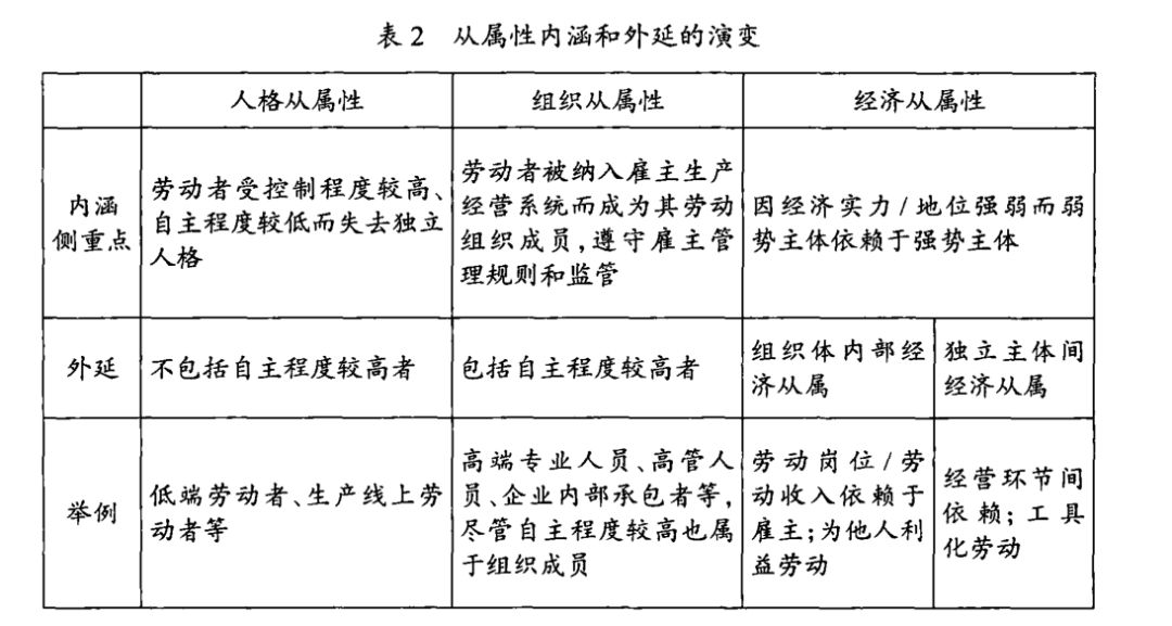 劳动法的发展史表明,作为倾斜保护和社会保护对象的劳动者范围随着保护手段的多样性和可选择性的增强而不断扩宽,这种趋势是由劳动关系(从属劳动)认定标准的相应放宽所支撑的。依此思路来考察作为劳动关系认定之核心标准的“从属性”的三种理解即人格从属性、组织从属性和经济从属性,比较它们的内涵和外延就可发现,由人格从属性到组织从属性再到独立主体间经济从属性,是通过从属性内涵的演变而不断扩大从属性外延,亦即不断扩大劳动法适用范围的发展过程(参见表2)