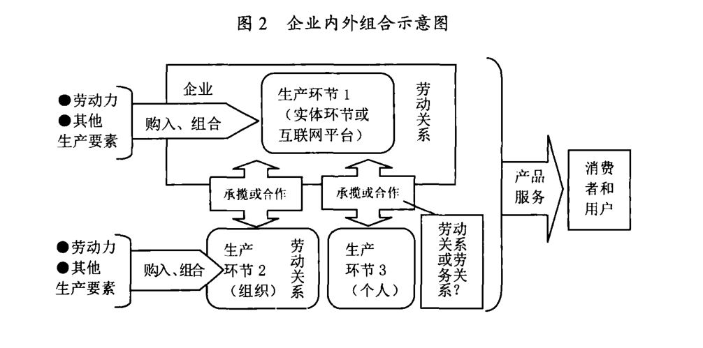 19世纪后期,随着内燃机、电力的大规模应用和发展,以及单一性市场需求的快速增长,福特制大规模生产方式逐渐替代了传统单件生产方式。于是,“大多数生产都发生在企业中”,生产要素企业内组合和工厂内从属性劳动用工成为主流。20世纪70年代后,基于产品市场、资本市场和技术条件的巨大变化,西方发达国家的生产组织方式开始从福特制向后福特制转型,生产要素组合从企业内组合逐步转向企业内外组合。在“互联网+”时代到来之前,企业内外组合生产要素的用工形式已经大量出现。