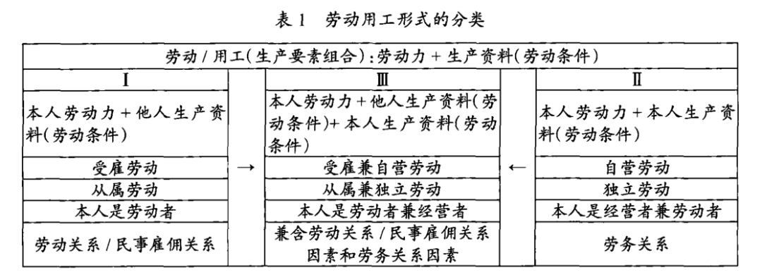 在表1所示的分类中,“Ⅰ”类形式因生产资料(劳动条件)占有者较之劳动力所有者具有强势地位,而为受雇劳动和从属劳动;“Ⅱ”类形式因劳动力和生产资料(劳动条件)归属同一主体而为自营劳动和独立劳动;“Ⅲ”类形式则是前两类形式的混合。现实中的“网约工”,除自供生产资料外,互联网平台及其信息服务、管理规则等也是不可或缺的生产资料(劳动条件),故宜归类于“Ⅲ”类,将其归类于“Ⅱ”类,则有失偏颇。至于其从属性和独立性各占多大比重,则取决于在其劳动条件体系中本人劳动条件较之他人劳动条件的地位。