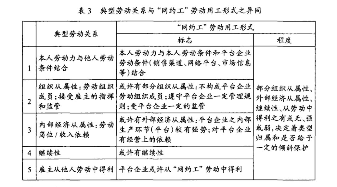 鉴于现行劳动立法“要么完全保护、要么完全不保护”之弊端,对“网约工”劳动形式应当划分为三类,一是非典型劳动关系,二是独立劳动,三是中间类型——准从属性独立劳动,对非典型劳动关系和准从属性独立劳动分别给予一定力度的,倾斜保护,而对独立劳动则不给予倾斜保护。以典型劳动关系为参照,这三类形式的异同可作如表3所示的描述。