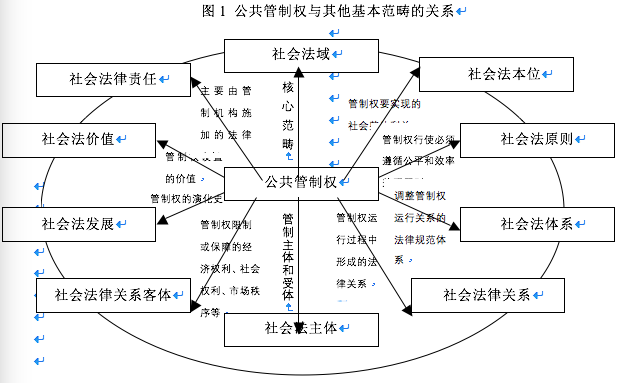 在社会法学基本范畴中,公共管制权内涵最为丰富。作为核心范畴,公共管制权是对社会法学众多基本范畴的的概括与总结,构成社会法学的基本元素和逻辑起点。公共管制权是我们认识研究社会法学的起点,也是认识研究社会法学的终点,是社会法学区别于私法学和公法学的标记。图1展现了公共管制权为其它范畴所不能替代的统驾全局的能力,全部的社会法规范和社会法学问题都以胚芽的形态包含于公共管制权这一核心范畴中,“是它的逻辑演化的产物、表现和实现环节”。