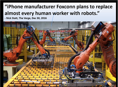 富士康将用机器人替代全部工人。苹果代工厂富士康试图用自动化代替人类劳动意味着机器人正大举进军制造业。制造业未来可能存在于“黑暗工厂”中,那里的工人非常少以至于“你可以关掉灯,把这个地方留给机器。”“熄灯制造”——消除了人类工人在生物、心理、社会和政治方面的挑战和限制——这是工业幻想家们长期以来的梦想,现在正逐渐成为现实。