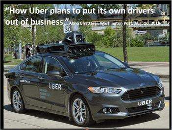Uber开始推动利用自动驾驶技术取代司机。美国大约有500万司机,其中200万到400万人可能被自动驾驶汽车取代。妨碍自动驾驶技术普及部分原因是安全问题。然而,一些研究表明在许多情况下自动驾驶汽车已经比人工驾驶汽车更安全。例如,2019年底,特斯拉报告称司机在未开启“自动驾驶仪”的情况下,每百万英里发生的事故是开启“自动驾驶仪”时的近两倍。虽然仍存在自动驾驶技术和监管方面的障碍,但自动驾驶技术的普及与由此导致的失业只是时间问题。