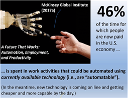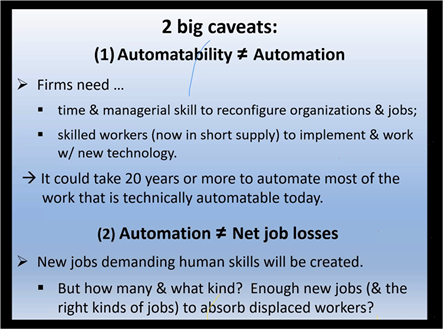 第一,自动化的可能性不意味着自动化的现实性。自动化需要很长时间与很多技术。有时候需要一些不容易得到的工人来实际实施这项技术。因此,根据经济创新的过去模式,kenzie的人估计,要实现所有目前已经实现自动化且有能力实现自动化的工作,可能需要20年的时间。