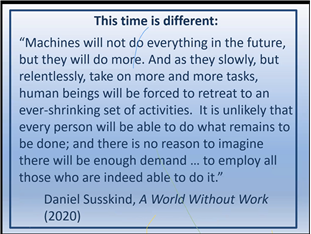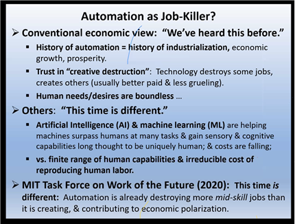 麻省理工学院未来工作特别小组(MIT Task Force on Work of the Future)得出结论:这一次与以往不同。他们的研究表明自动化摧毁的中等技能岗位已经比创造的更多。因此自动化已经取代了过去惠及所有人的增长和繁荣。在20世纪的大部分时间里自动化掏空了劳动力市场的中间部分并为富人和那些因自动化而技能提高的人创造了巨大的财富与巨大的剩余利润,但它摧毁了那些中间的工作,把工人推向了就业市场的更底端,使得经济两极分化。