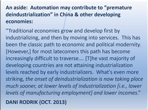 然后,Cynthia Estlund教授提及了自动化浪潮下美国新创造的工作赶上工作消失速度的条件与中国等发展中经济体过早“去工业化”可能引发的问题: