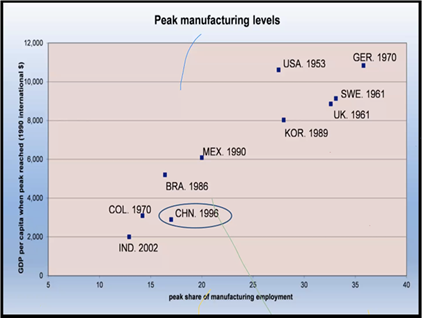 此外,自动化可能会导致中国和其他发展中经济体过早“去工业化”。传统经济的增长和发展首先通过工业化,然后转向服务业,这是经济和政治现代化的经典途径。然而,对其大多数后发国家来说,这条路更为艰难,因为绝大多数发展中国家没有达到早期工业化国家所达到的工业化水平。更令人震惊的是,低工业化水平(制造业水平较低)与低收入国家,“去工业化”开始的时间更早。