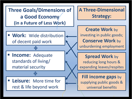 为了实现这些目标,我曾经提出了三大理念,即全民基本收入(universal basic income ,UBI)、联邦工作保障(federal job guarantee ,JG)和更短的周工作时间,这些理念被一些人作为未来更少工作的解决方案。然而即便我们把这三大理念所面临的令人生畏的现实和政治障碍放在一边,其各自也都具有盲点,因为在良好的生活和良好的经济方面,无论是工作、休闲或收入上每一个理念都没有直击问题关键。三大理念无法创设一个令人满意的工作减少的未来。因此,我提出了一个减少工作的未来的三维战略——目标是在全社会更加平衡地分配工作和休闲与适当的收入。三维战略不同于三大理念,它们彼此兼容,可以以多种方式结合。暂且不谈政治上是否存在可能性这一关键问题,三维战略的目的是让人们广泛享有基本经济保障,有更多时间享受工作之外的生活,并为有能力的人提供有偿工作。三维战略包括以下内容: