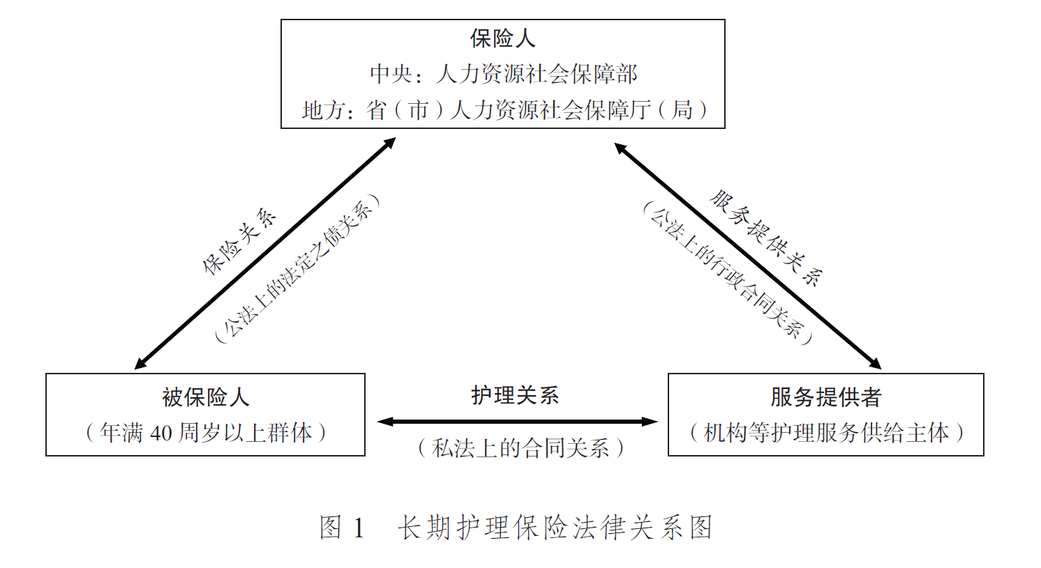 如前所述,立足于福利多元的逻辑,多重角色的参与必然意味着产生多重性的法律关系结构及差异化的规范体系。具体至长期护理保险中,保险人、被保险人和服务提供者等三个主要参与主体之间可以划分为保险关系、服务提供关系与护理关系三个层面,且应被分别定性为公法上的法定债之关系、公法上的行政合同关系及私法上的合同关系,并根据这三层法律关系的性质,来明确参与主体在各个关系中的主要权利义务,以塑造其应有的法律品格。