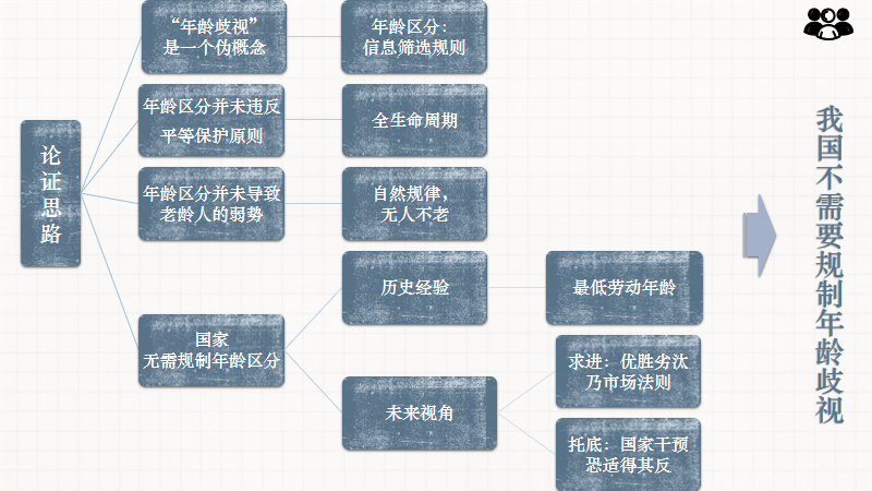 以下是我们论证的基本思路:首先,只有明确概念才能展开有效的讨论,我们小组认为所谓的“年龄歧视”是一个伪概念,其本质乃是一种“年龄区分”,因此国家无需管;其次,我们小组认为,年龄歧视既未违反平等保护的原则,又非导致老龄人弱势的原因,因此国家不必管;最后,我们通过回顾历史与展望未来,认为以年龄作为劳动者的划分标准有其合理之处,而且,从求进的角度出发,优胜劣汰乃市场法则,用工主体自觉地进行自我调适以提升竞争力,而着眼于托底的视角,美国的实践经验让我们看到强制干预恐将适得其反,因此国家不能介入以弱化年龄因素的影响力。