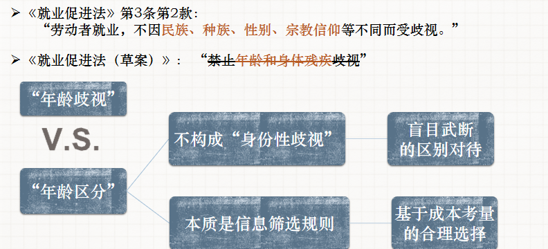 当下所针砭的所谓“年龄歧视”,更多指“年龄区分”。年龄区分更多是一种信息筛选规则。我国《就业促进法》第3条第2款规定,“劳动者就业,不因民族、种族、性别、宗教信仰等不同而受歧视”,删去了《就业促进法(草案)》中禁止年龄和身体残疾歧视的规定。因此,必须加以思考的是民族、种族、性别、宗教信仰歧视究竟具有何种性质,以及基于年龄的区分和差别对待是否与其性质相同。