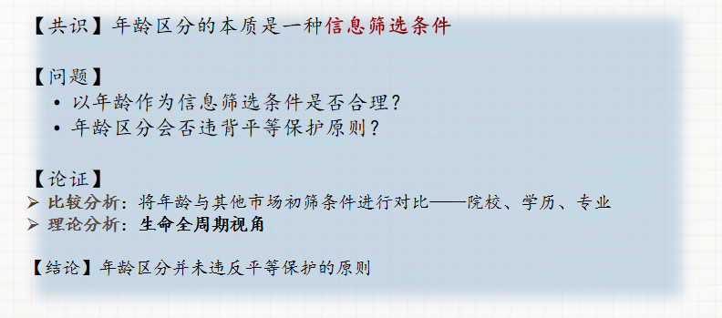 但年龄区分与之不同,与其说是一种身份性的歧视,其更是基于成本考虑的一种信息筛选规则。在就业市场之中,用人单位不可能无限制的扩大其挑选员工的范围,而必须借助一些简要的标准进行初选。年龄虽然不能完全准确衡量个人能力,但在很大程度上能够反映一个人的体力、学习能力等信息。反过来说,这同样也节省了潜在的就业者的信息筛选成本,降低了其求职过程中的盲目性。