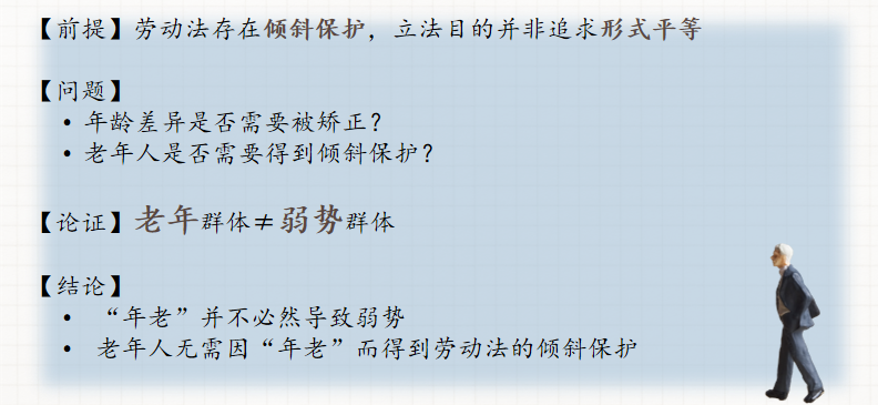 诚然,生活中充斥着诸多不可控因素,即便是身体健康的人也可能遭遇意外而成为残疾人,有长期职业规划的人也可能遭遇不可控的危机而下岗,劳动法的精神内核也是一种对弱势群体关怀。那么,若就业者因年龄区分的原因而成为了弱势群体,法律上也应当对其进行保护,哪怕会在一定程度上损害雇主的利益,我国劳动法对于残障就业者的保护也是基于这一出发点。