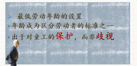 如前所述,年龄之所以自然而然地成为区分劳动对象的标准,是因为其与劳动能力具有高度的相关性,例如各国劳动法正是通过划定最低劳动年龄,以避免重现工业革命时期对幼童的无度剥削,例如:据统计, 1816年在英国的棉纺织业中大约有20%的工人年龄在13岁以下;1835年尽管技术发展已经降低了对儿童劳动的需要, 13岁以下的童工仍占了全体纺织工人总数的13.1%。[1]童工权益保障也是劳动法的源头之一,因为在传统的劳动力导向型社会中,繁重而机械的劳动内容、恶劣的劳动环境对于儿童的成长没有任何助益,反会阻碍儿童的心智发展,所以这种 “一刀切”显然不是出于对儿童的歧视,恰是一种保护。