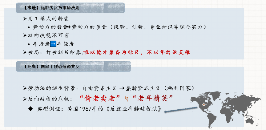我们无可否认,即便年龄区分永远客观存在,使得“年龄歧视”成为一个伪概念,也无法当然地排除国家规制的必要性,毕竟文明发展的进路就是摆脱先天的局限,让人自由而平等地成其所应是,此时讨论的焦点就转化为:国家是否需要介入规制,以弱化年龄因素对就业的影响?