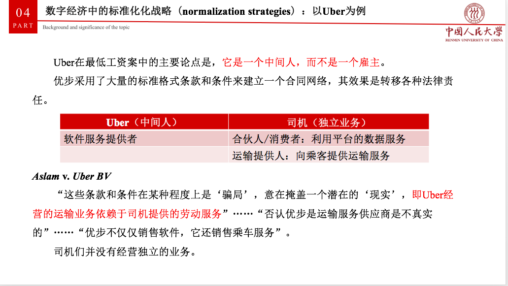 结论部分讲了三件事情,第一件是灵活的工作模式需求造就了平台经济,比如优步司机对灵活用工的渴望是零工经济的推动力之一,同时平台经济又推动了灵活用工的工作模式。第二件是平台经济对工人联合而言将是机遇,这指的是工人可以通过线上平台组织工会运动了。第三件事就是对全文的总结,就是劳动法的未来取决于决策者对千变万化的现实的应变,对法律范式的改变正如文章所提是多方面的。